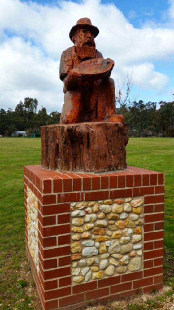 Either side of the main gate stand two impressive, huge, carved wooden statues - one a shearer and the other a gold panner.