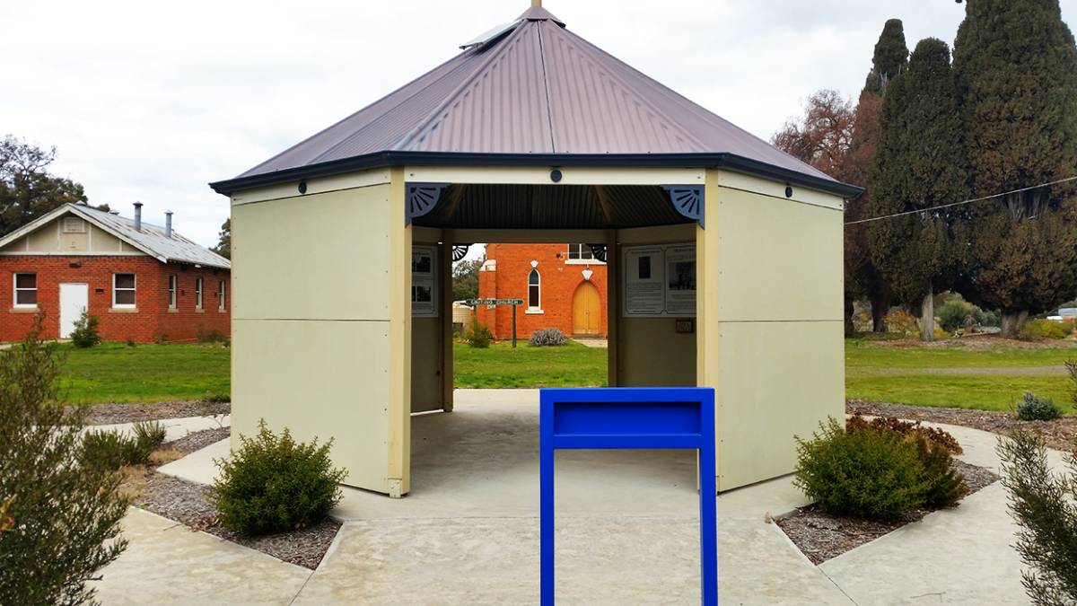 A gazebo containing many detailed information signs lies alongside a picnic table. The memorial lies within a grassy area alongside the Pyrenees Highway.
