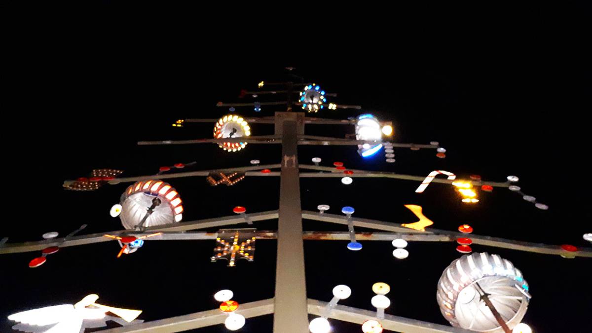 The permanent Christmas tree is constructed from square steel tube, decorated bike wheels (with altered spokes to catch the wind), house air vents and at least 1,500 reflectors.
